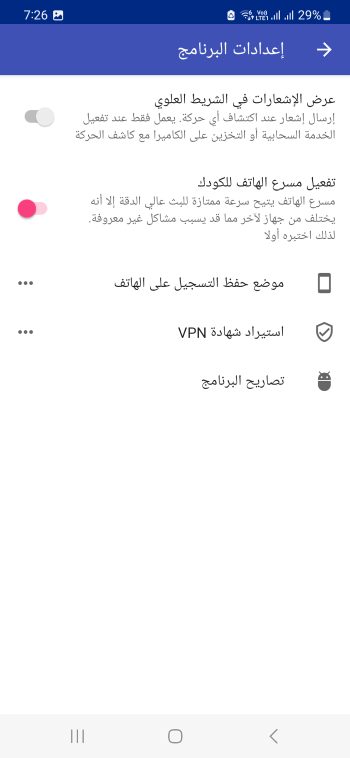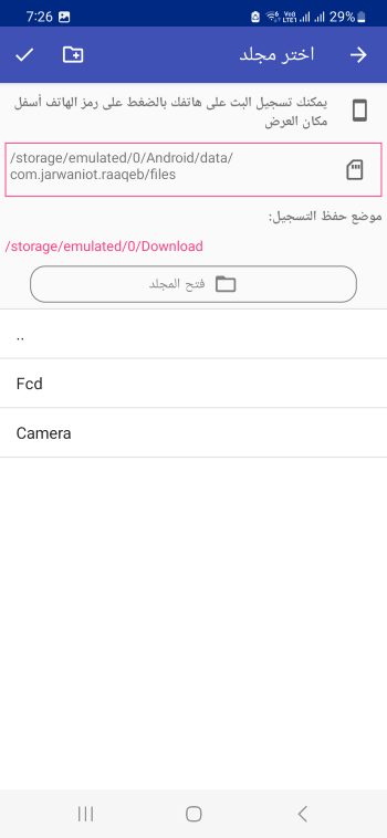 Download، في نفس الوقت سيتم عرض جميع المخازن مثل بطاقة SD أو الخازنة الداخلية (تحت مجلد البرنامج Android/data/com.jarwaniot.raaqeb/files)Android/data/com.jarwaniot.raaqeb، سيقوم الاندرويد بحذف هذا المجلد عند إزالة البرنامج فعليك التنبه