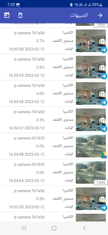 -> التنبيهات وتتضمن جميع المقاطع التي قامت الكاميرا بتسجيلها (وتخزينها على الكاميرا أو Google) على التفصيل التالي